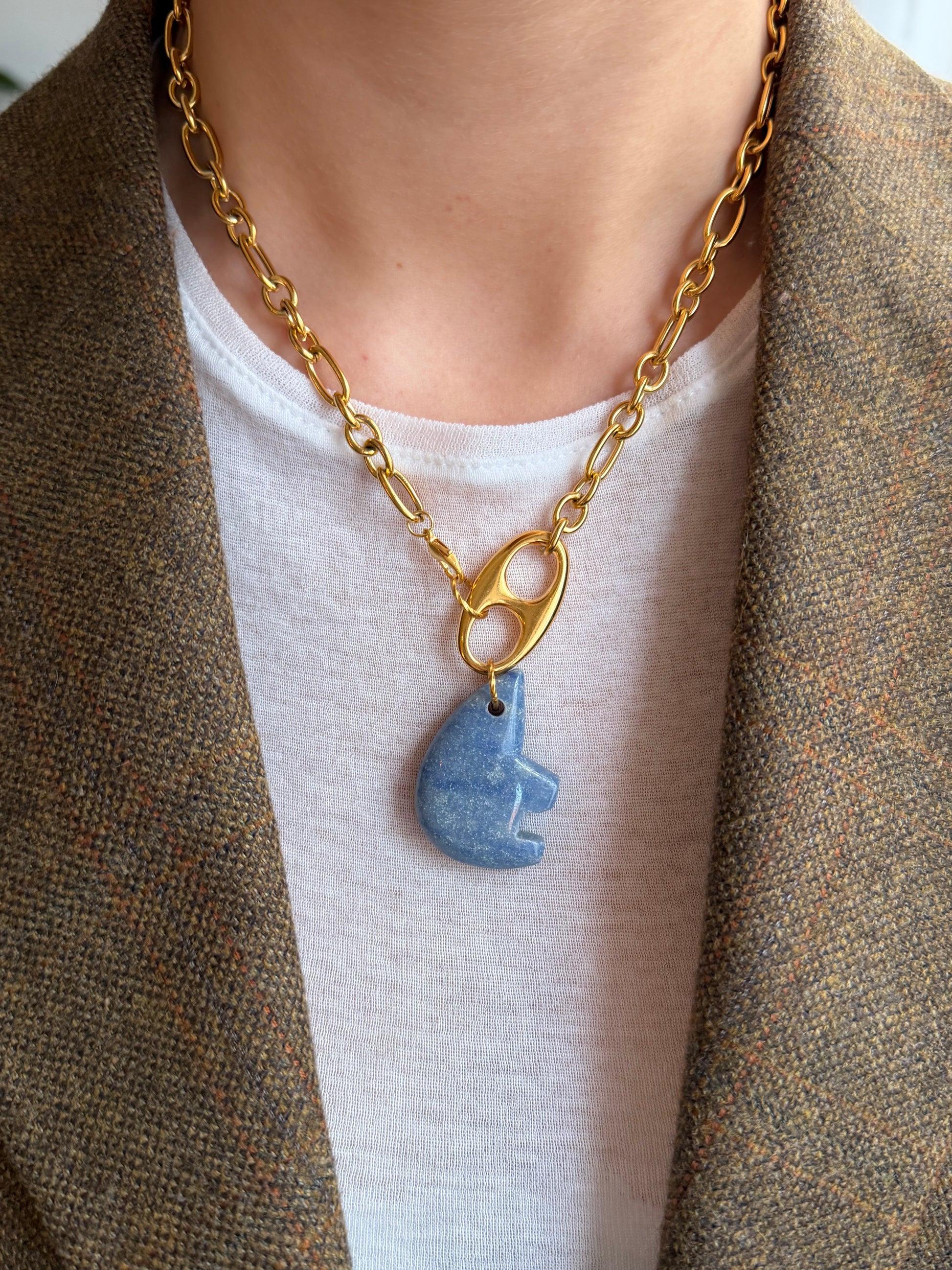 Handgemaakte ketting met opvallend jasseron gemaakt uit stainless steel met een unieke bedel van natuursteen. Deze ketting is opvallend en maakt elke outfit leuk!