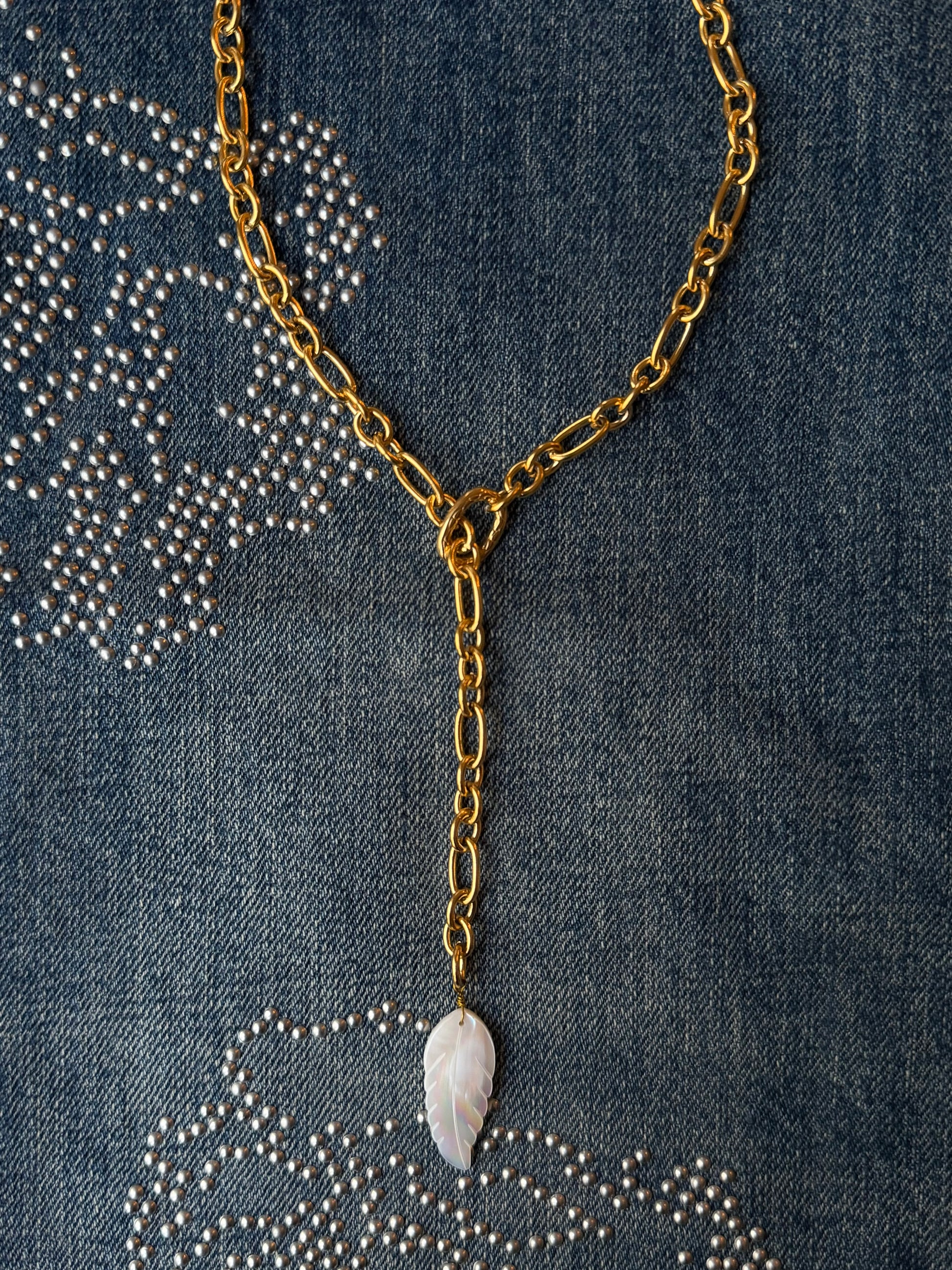 Handgemaakte ketting met schakel jasseron gemaakt uit stainless steel en parelmoer bedel. De lengte kan zelf aangepast worden.